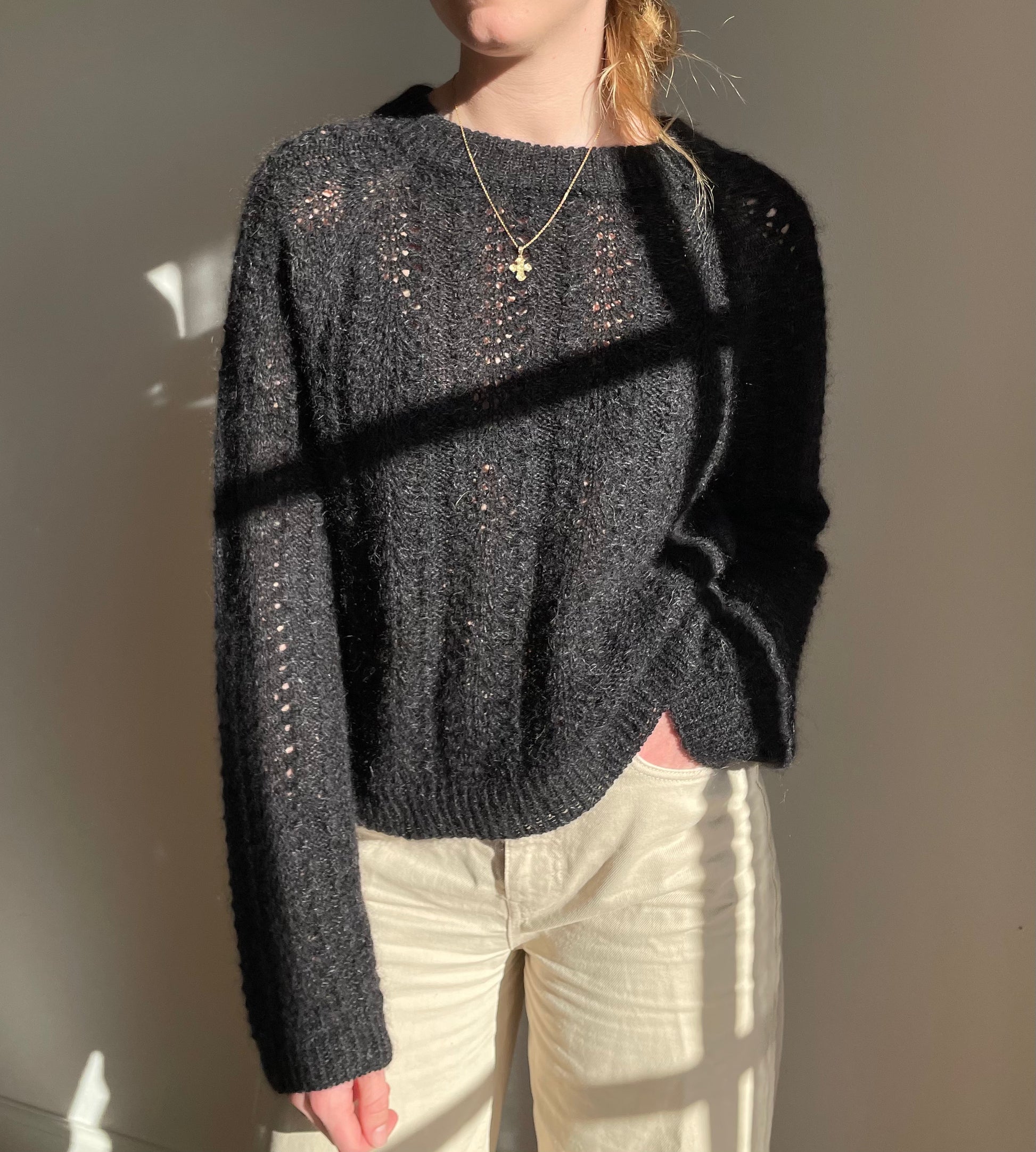 Ærmerne strikkes herefter ved at sætte de hvilende masker tilbage på pinden og samle yderligere masker op i ærmegabet. Ærmerne strikkes ligeledes i hulmønsteret og der laves indtagninger på undersiden af ærmerne. Der afsluttes med drejede ribkanter og italiensk aflukning.