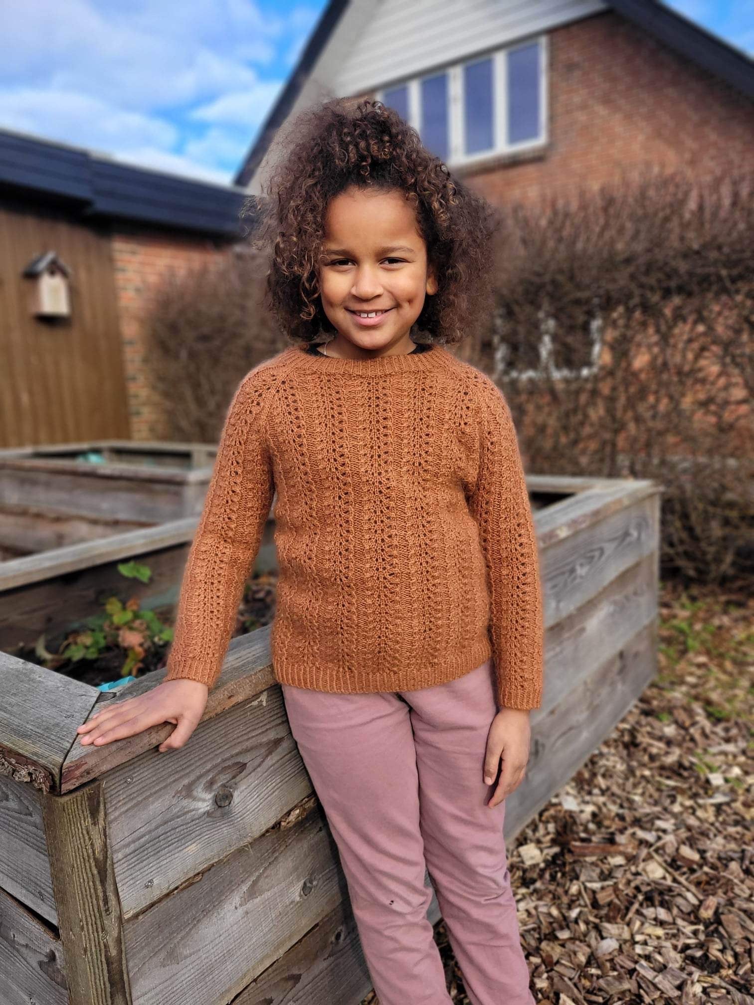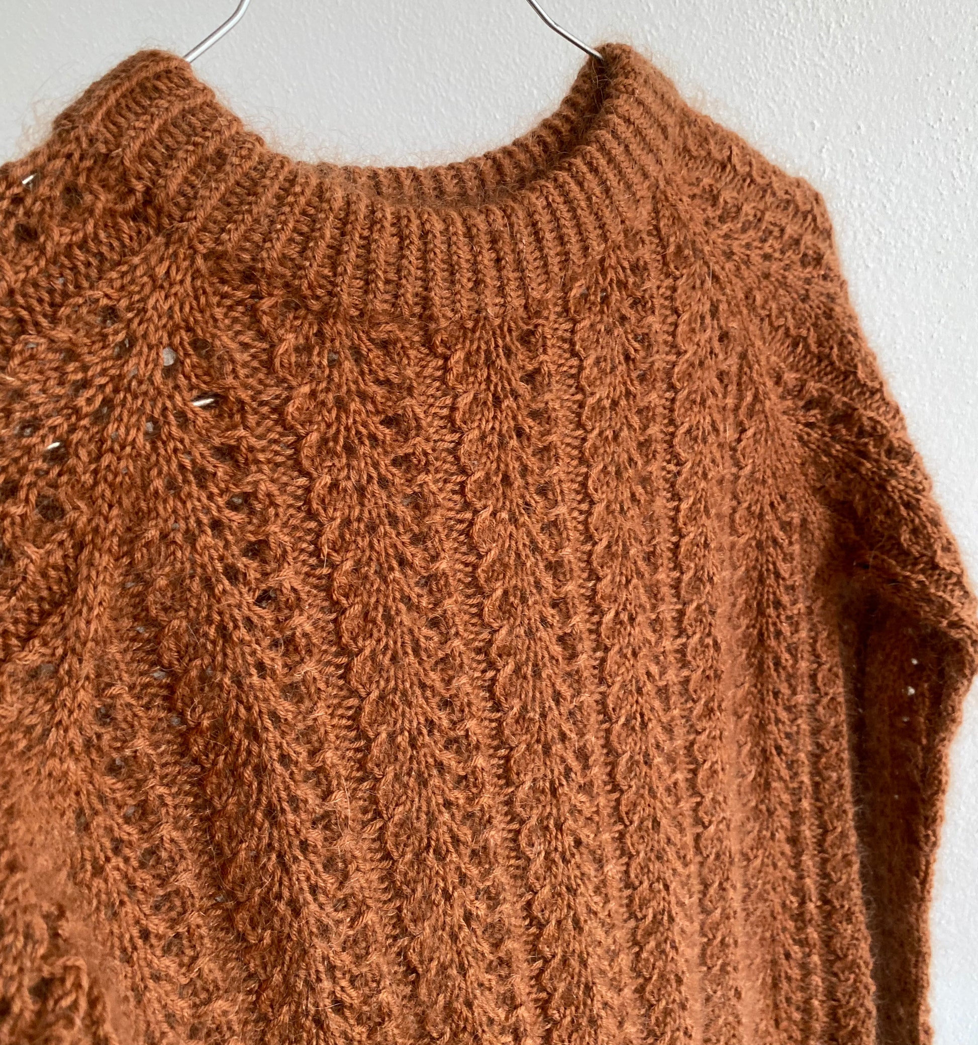 Ermene strikkes deretter ved å sette de hvilende maskene tilbake på pinnen og samle ytterligere masker opp i ermegapet. Ermene strikkes i hullmønsteret, mens det løpende felles og avsluttes med vridde ribbkanter og italiensk avfelling.