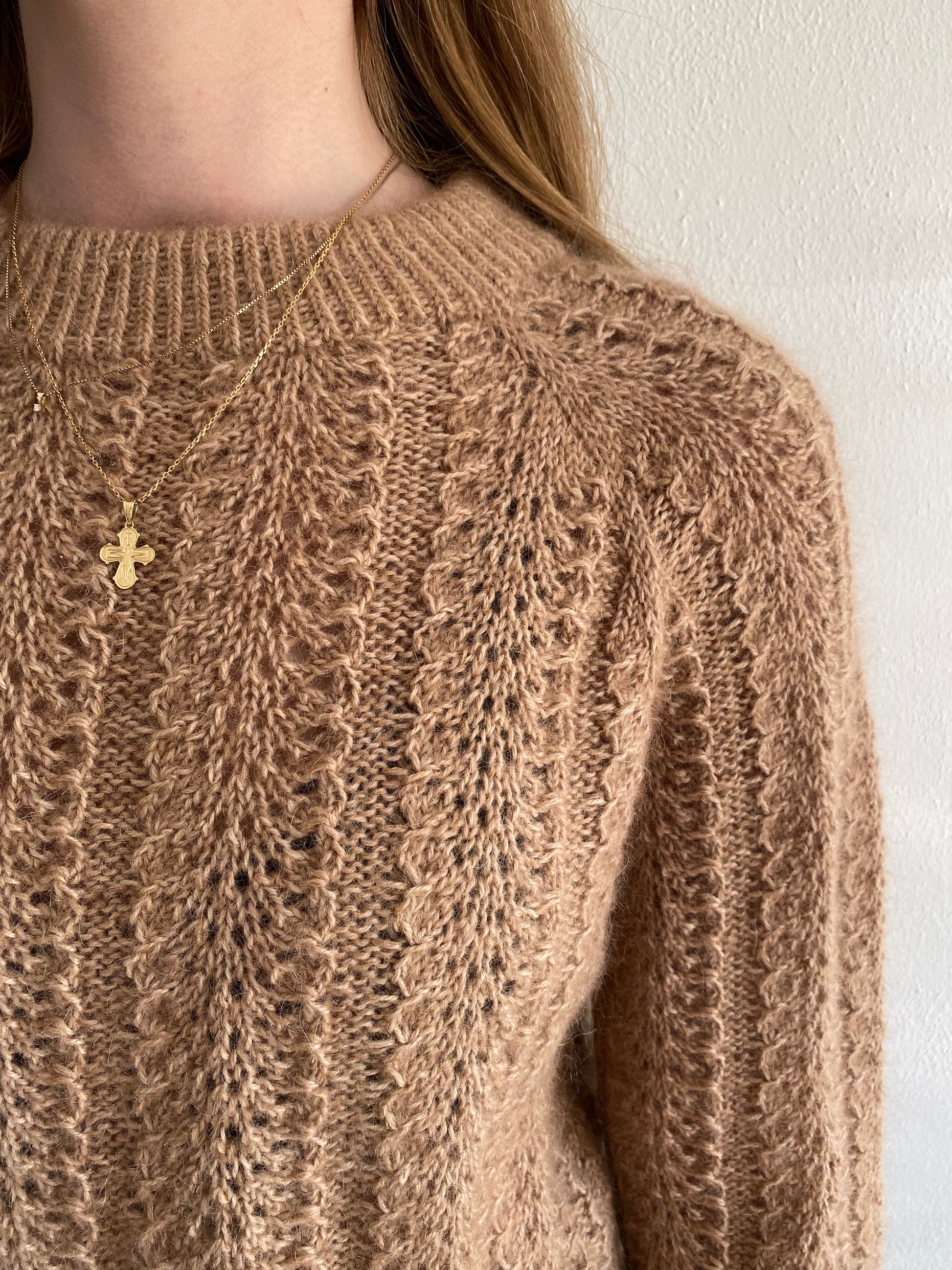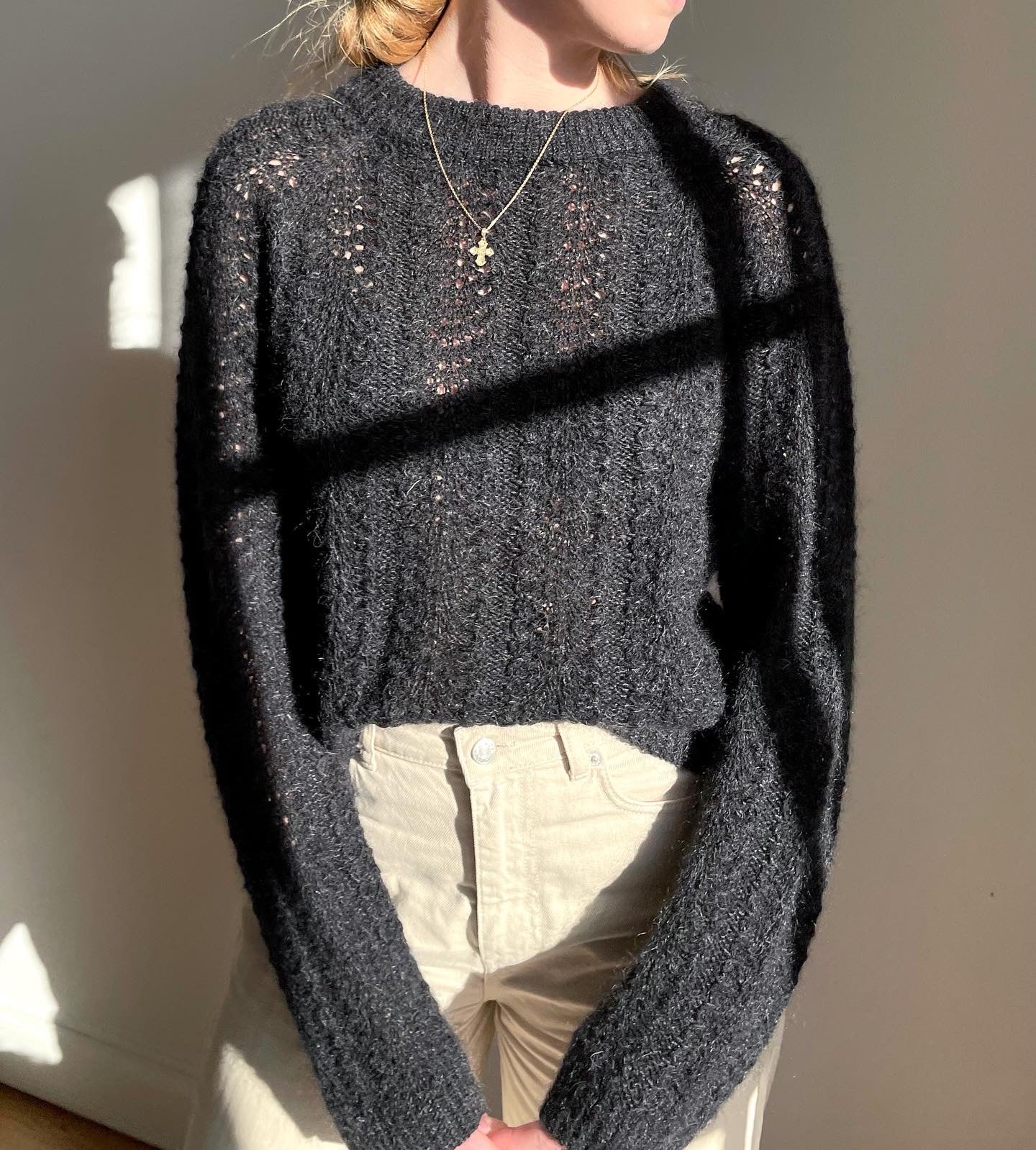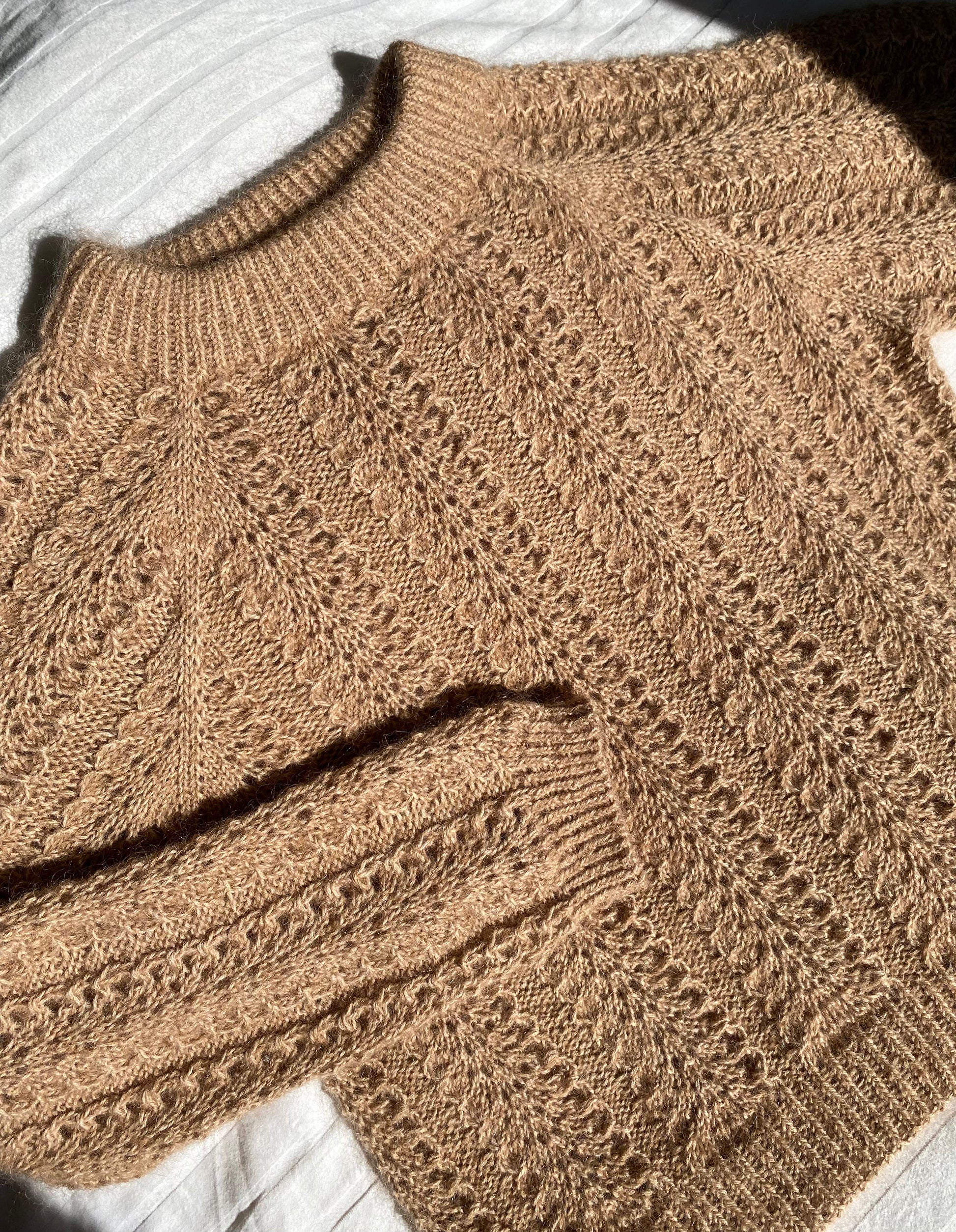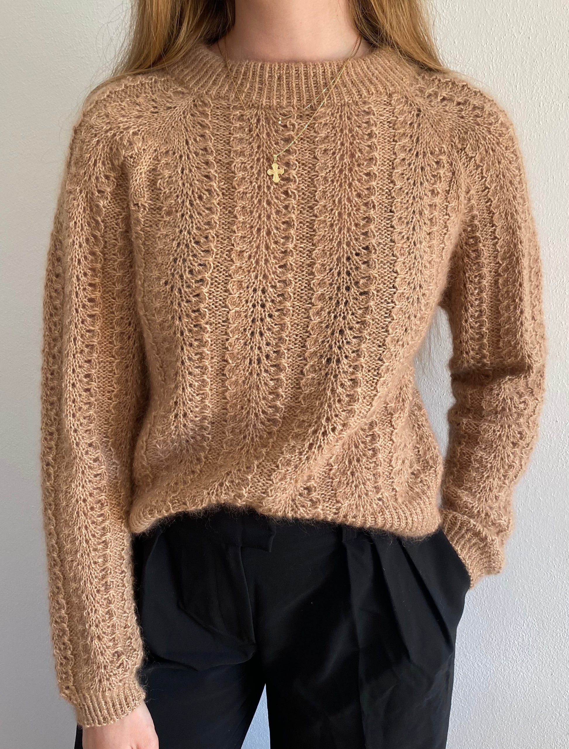 Ermene strikkes deretter ved å sette de hvilende maskene tilbake på pinnen og samle ytterligere masker opp i ermegapet. Ermene strikkes i hullmønsteret, mens det løpende felles og avsluttes med vridde ribbkanter og italiensk avfelling.