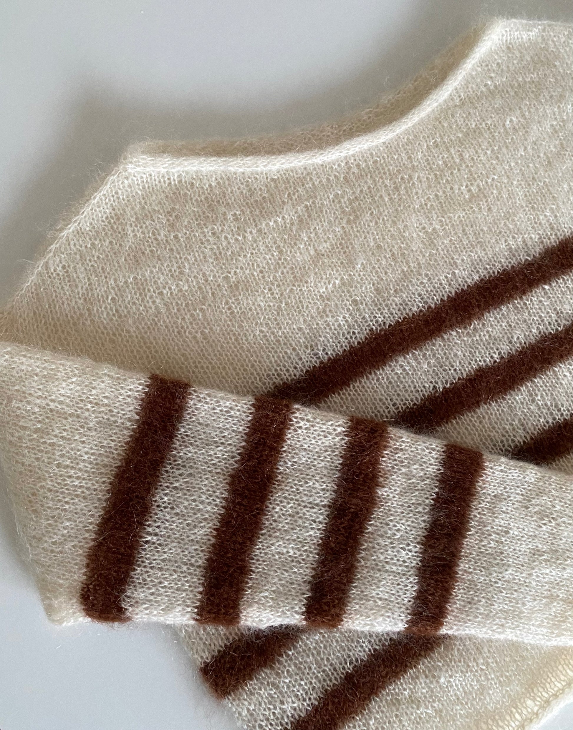 Den hvid/brun stribede: 2 tråde Drops Kid-silk i fv. 01 natur og 35 chokolade