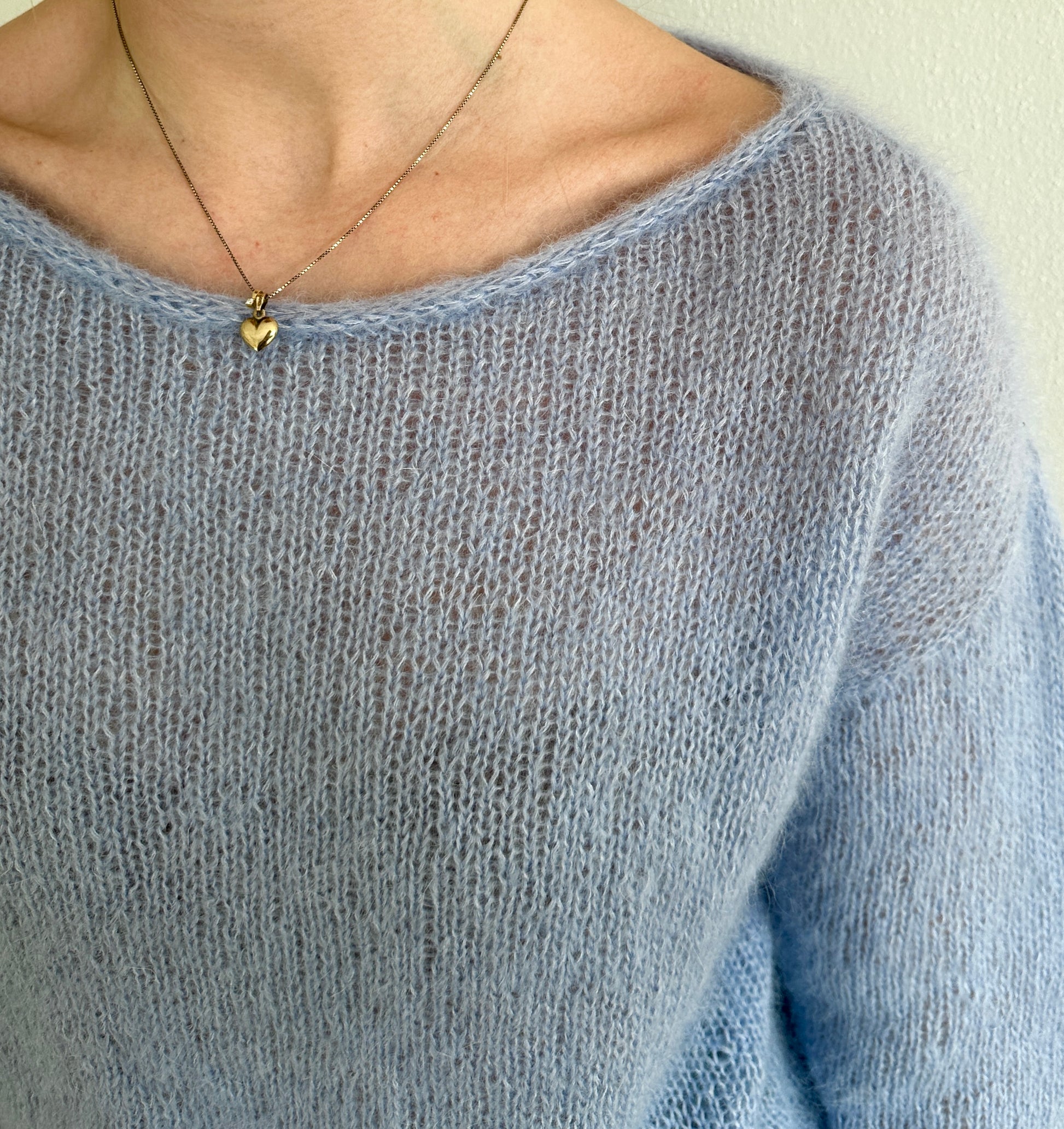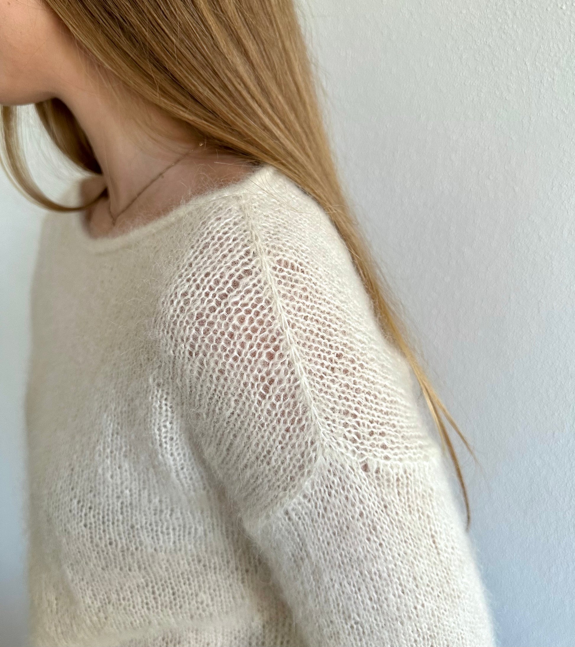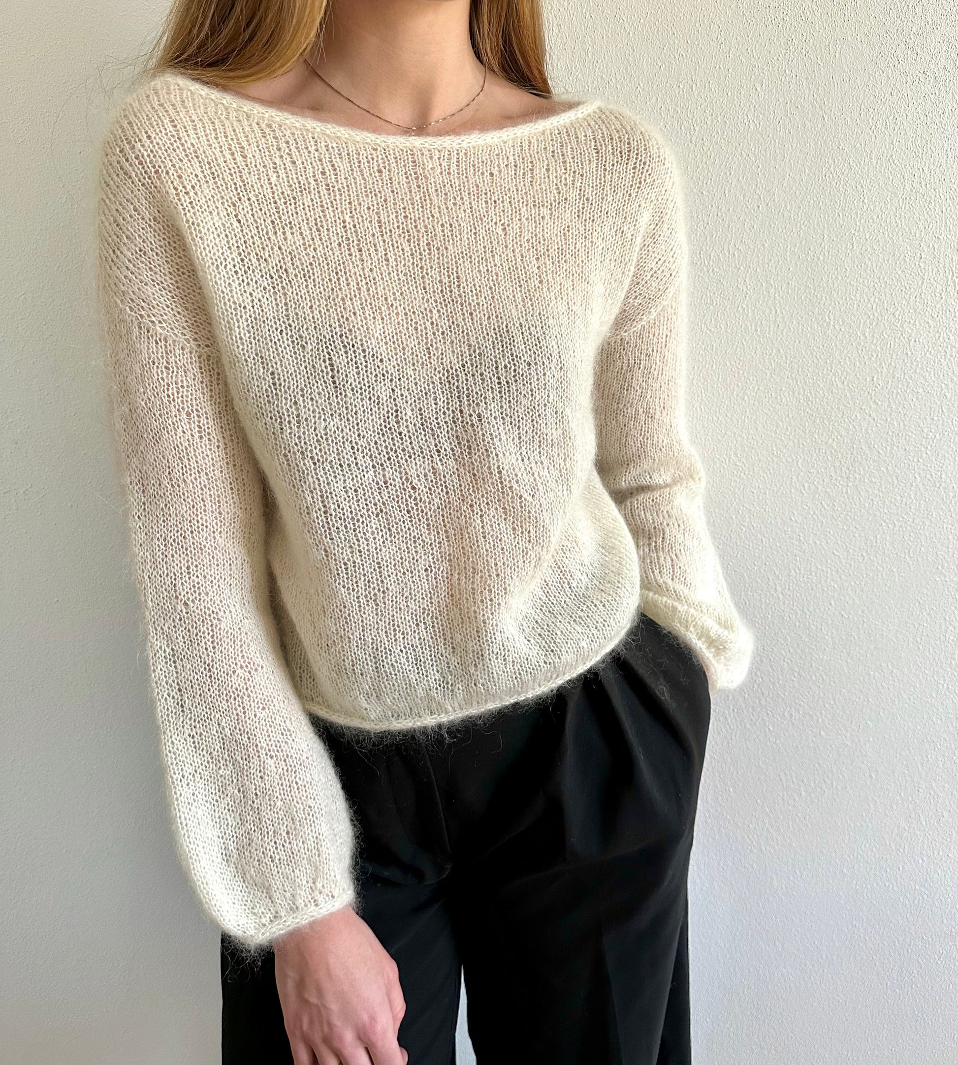 Maskerne deles til et for- og bagstykke, der strikkes hver for sig. De samles igen under ærmet og kroppen strikkes rundt i glatstrik. Der afsluttes med en i-cord kant. Herefter samles masker op langs halskanten, der ligeledes strikkes som en i-cord kant. Der samles så masker op til ærmerne, der startes med vendepinde. Herefter strikkes i glatstrik med, enten ud- eller indtagninger undervejs, afhængigt af om der ønskes ballonærmer eller lige ærmer. Ærmerne afsluttes ligeledes med i-cord kant.
