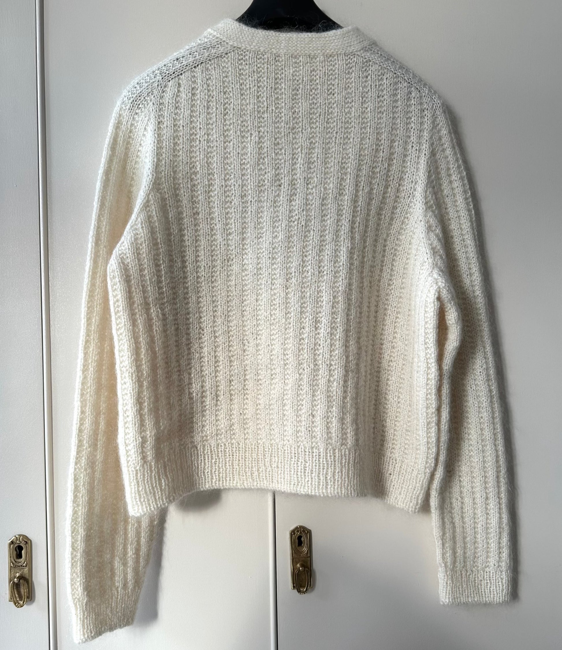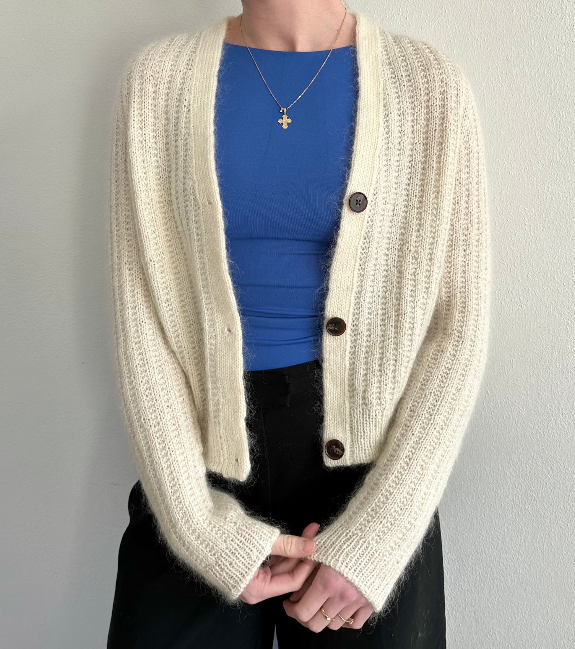 Cardiganen er konstrueret med en saddelskulder. Der slås først masker op til rygstykket, hvorefter der strikkes frem og tilbage, mens skuldrene og halsåbningen skabes gennem udtagninger. Når alle udtagninger til ærmerne er lavet, sættes ærmemaskerne til hvile, mens kroppen forlænges ved at strikke frem og tilbage. I bunden laves en ribkant, som afsluttes med dobbeltstrik og italiensk aflukning. Ærmemaskerne sættes tilbage på pinden og strikkes i perlerib-mønsteret, mens der laves indtagninger og afsluttes med en ribkant og italiensk aflukning. Afslutningsvist skal knapstolpen strikkes, ved at samle masker op langs halskanten og siderne, som strikkes i dobbeltstrik, mens der undervejs laves knaphuller.