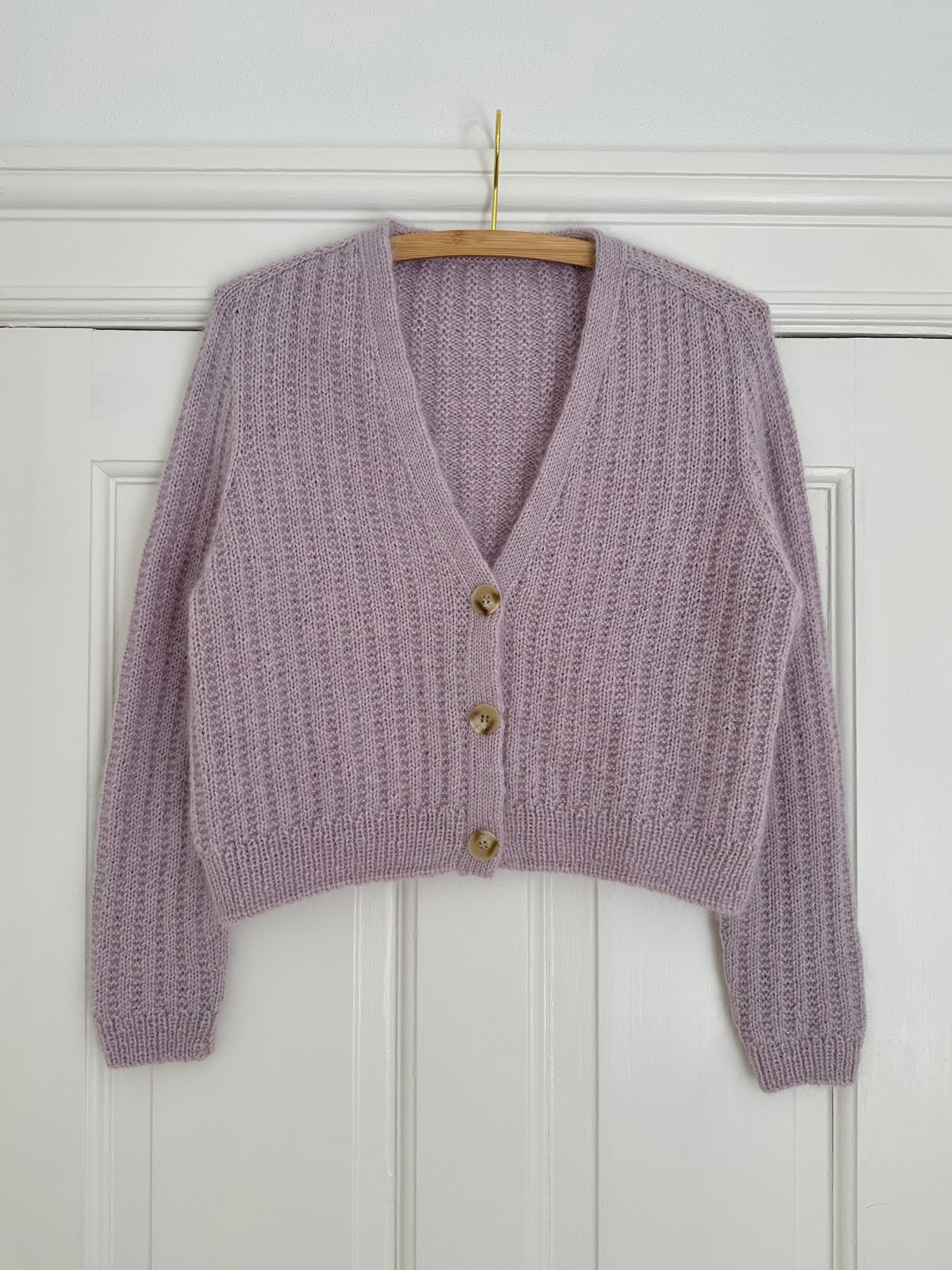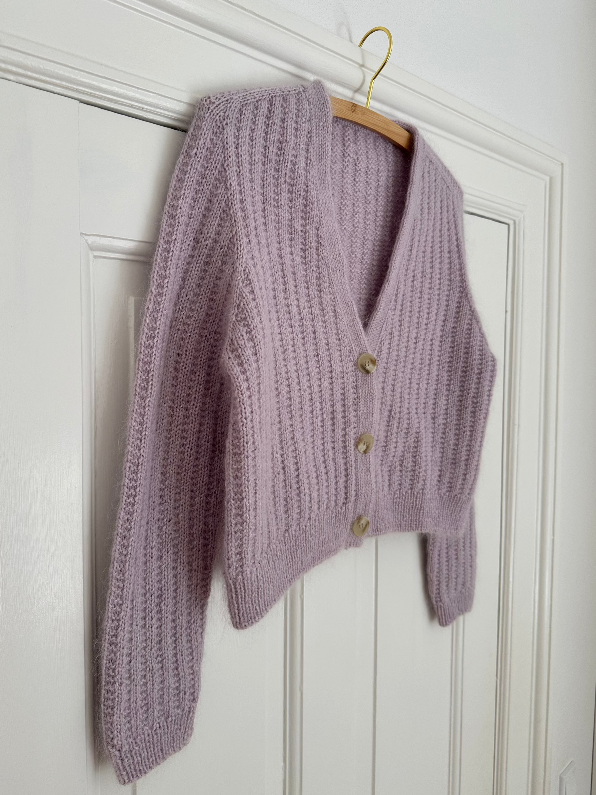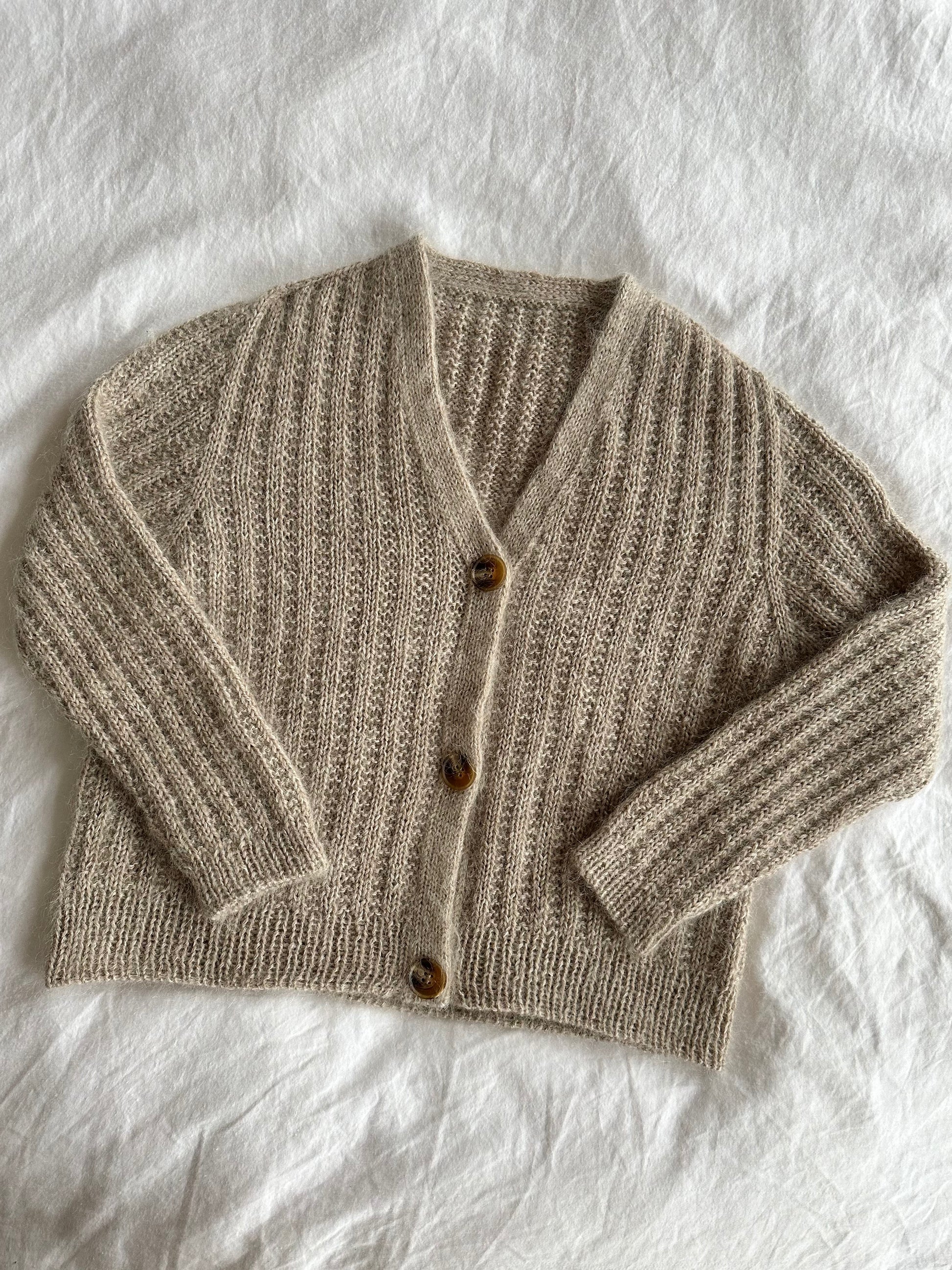 Denne cardigan er konstrueret med en saddelskulder, hvor der først slås masker op til rygstykket, hvorefter der strikkes frem og tilbage, mens skuldrene og halsåbningen skabes gennem udtagninger. Når bærestykket er færdigstrikket, sættes masker af til ærmer. Kroppen afsluttes med en ribkant og italiensk aflukning. Ærmemaskerne sættes tilbage på pinden og strikkes i perlerib-mønsteret, mens der laves indtagninger undervejs og afsluttes med en ribkant og italiensk aflukning. Afslutningsvist samles masker op langs hele åbningen og der strikkes en dobbelt-strikket knapstolpe med knaphuller.