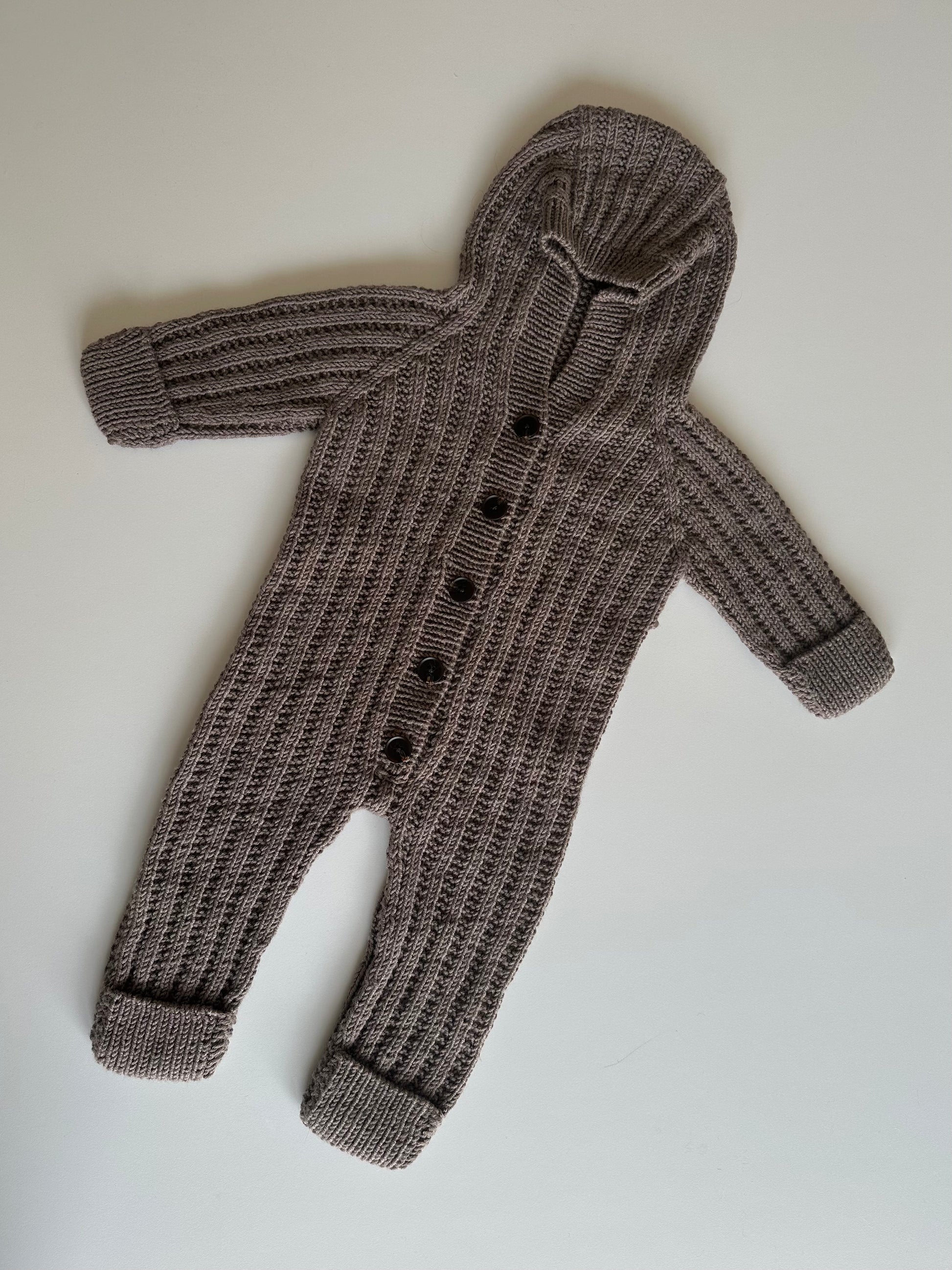 Dragten strikkes oppefra og ned. Der slås masker op til hætten, som strikkes frem og tilbage på pinden. Der samles herefter masker op på hver side, og hætten forsættes. Der laves indtagninger for at skabe nakken, og herefter raglan udtagninger på bærestykket. Der slås masker op i ærmegabet, og kroppen forlænges. Herefter samles kroppen, for atter at blive delt til de to ben. Benene strikkes rundt på pinden, mens der laves indtagninger. I bunden af både ben og arme strikkes en lap, der efterfølgende syes ned. Ærmerne strikkes ligeledes rundt på pinden med indtagninger. Afslutningsvist strikkes en knapstolpe med knaphuller, og der sættes knapper på.