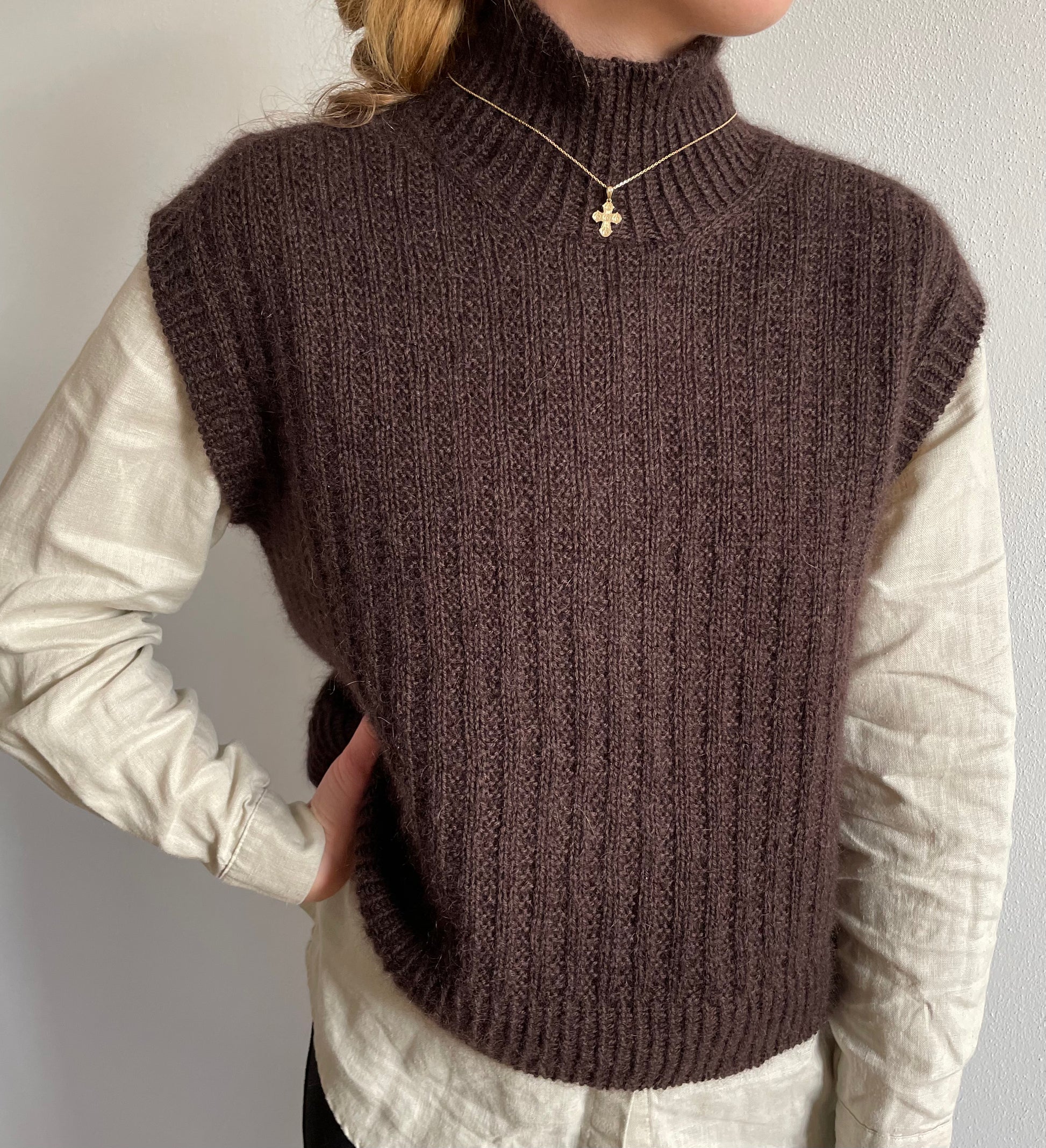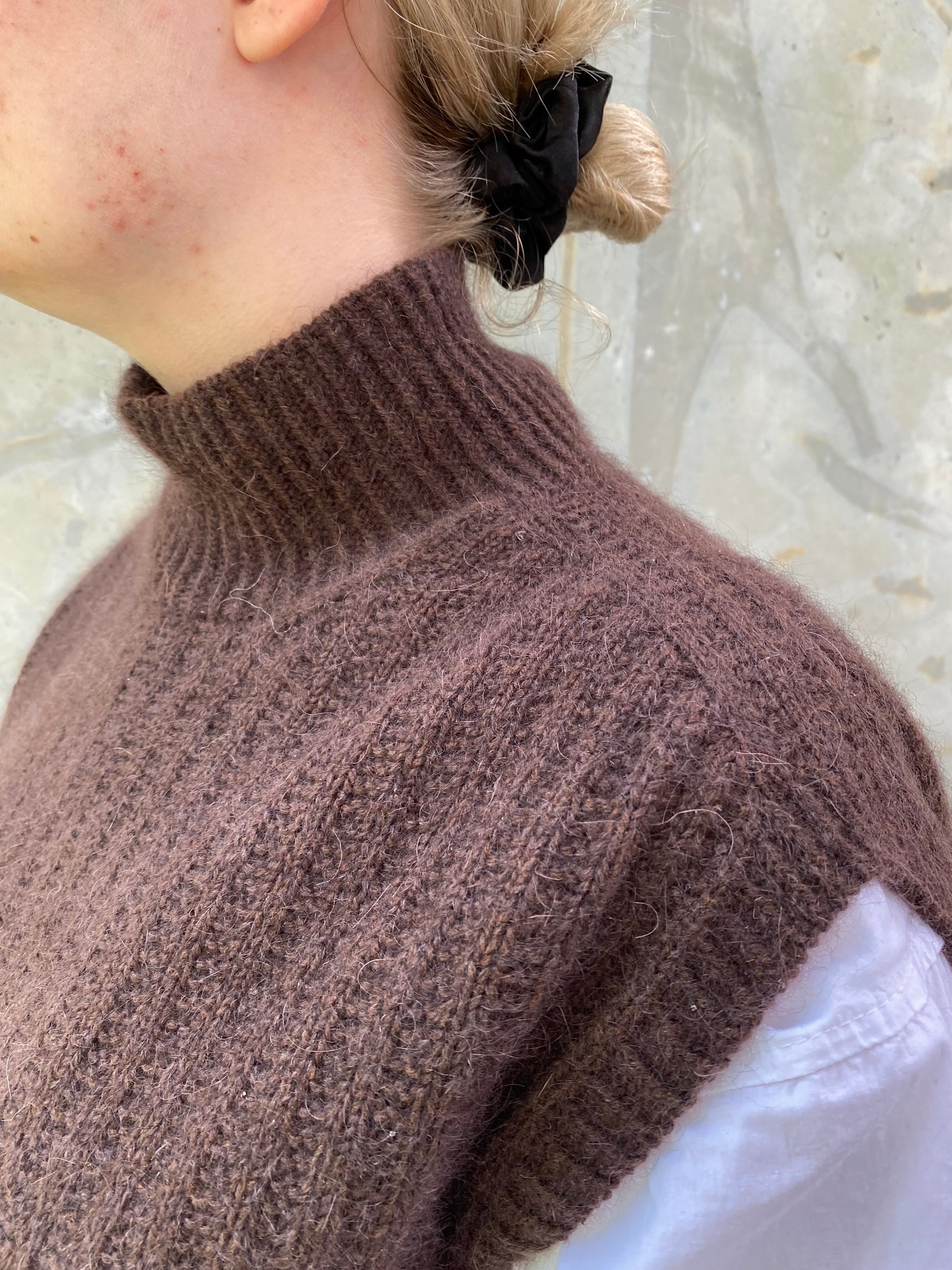 Denne slipover er konstrueret med en saddelskulder, hvor der først slås masker op til rygstykket, hvorefter der strikkes frem og tilbage mens skuldrene og halsåbningen skabes gennem udtagninger. Når bærestykket er samlet og strikket færdigt, deles arbejdet, så for- og bagstykket strikkes hver for sig. Kroppen samles igen mens ærmegabene afgrænses og strikkes færdig på rundpind, hvorved længden af slipoveren kan tilpasses. Kroppen afsluttes med en drejet ribkant og dobbeltstrik. Der samles herefter masker op i halsåbningen, som strikkes i drejet rib og afsluttes med dobbeltstrik. Afslutningsvist samles masker op i ærmegabene, som ligeledes strikkes i drejet rib og afsluttes med dobbeltstrik og italiensk aflukning.