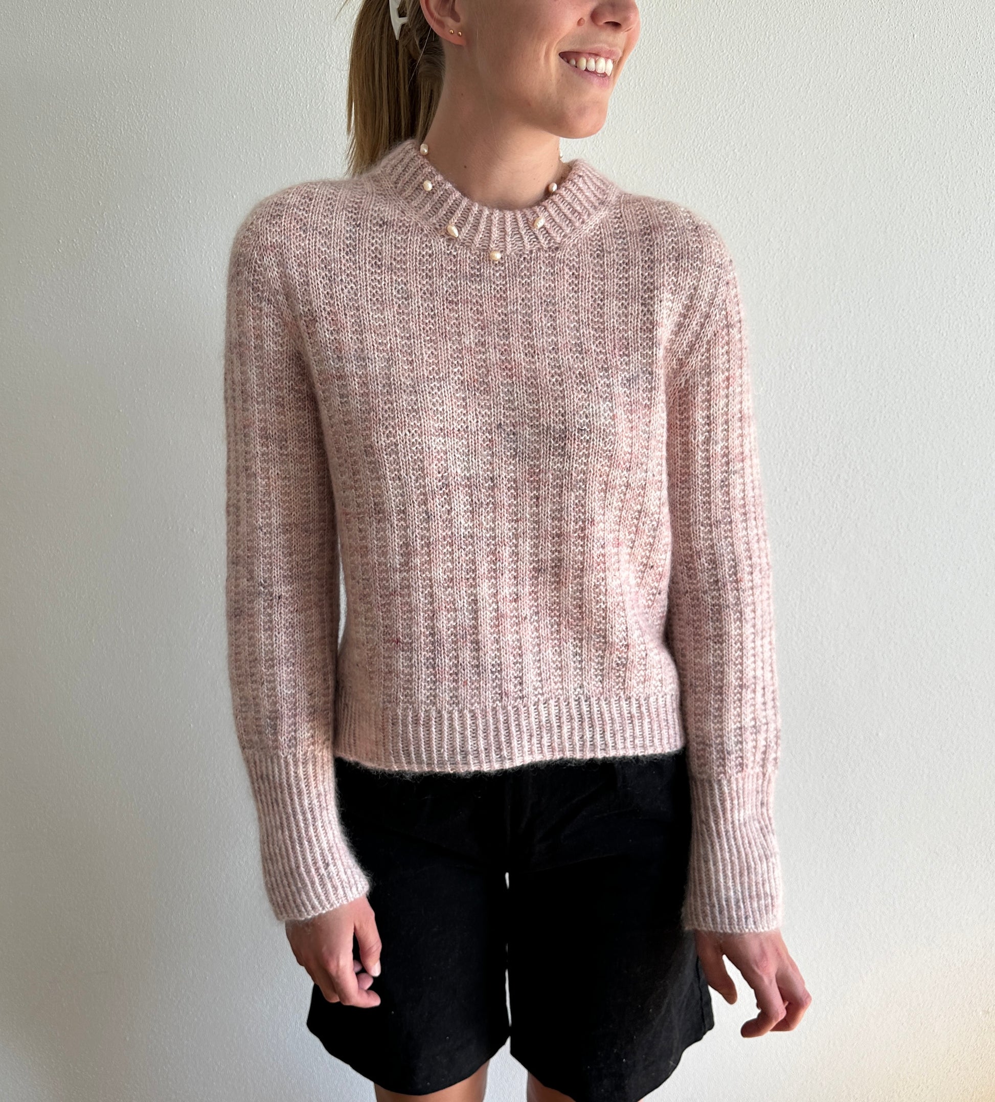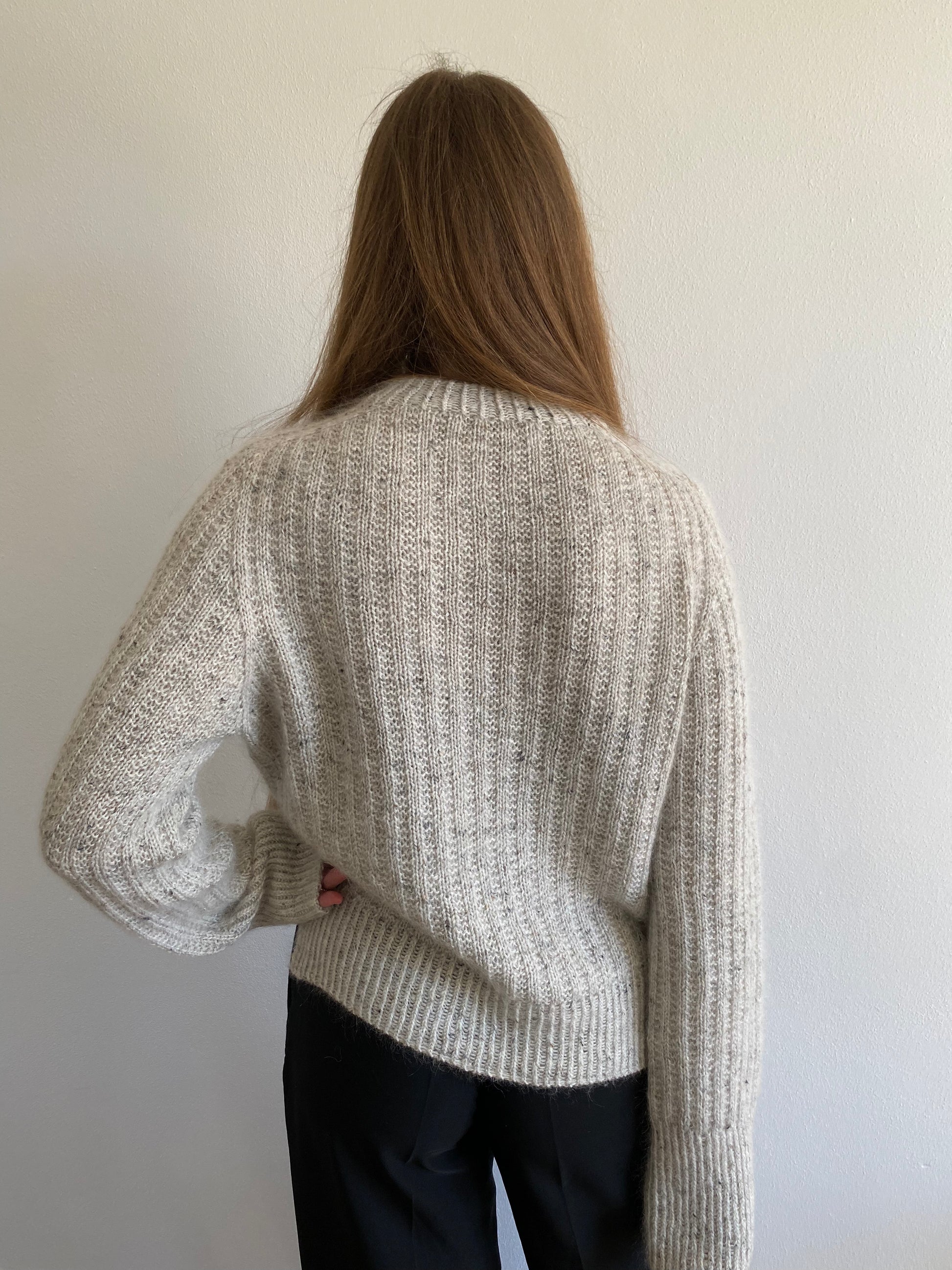 Denne sweater er konstrueret med en saddelskulder, hvor der strikkes frem og tilbage mens skuldrene og halsåbningen skabes gennem udtagninger. Kroppen strikkes færdig på rundpind, hvorved længden af sweateren kan tilpasses og prøves undervejs. I bunden af kroppen kan der strikkes en slids i hver side af den drejede ribkant, hvis det ønskes. Ærmerne strikkes i rib-mønsteret og afsluttes med en lang drejet ribkant og italiensk aflukning. Afslutningsvist strikkes en halskant i drejet rib, der foldes til en dobbelt halskant.