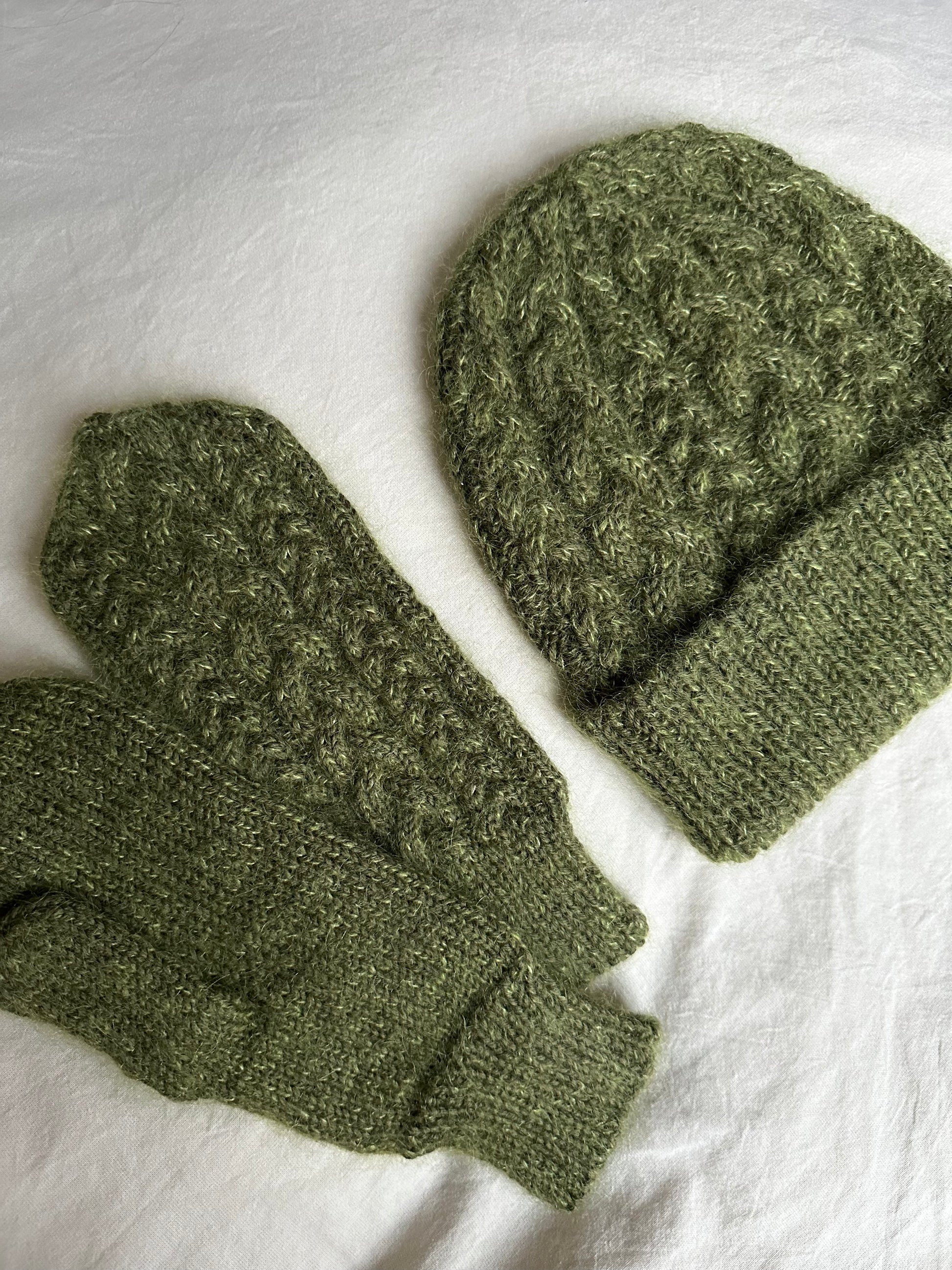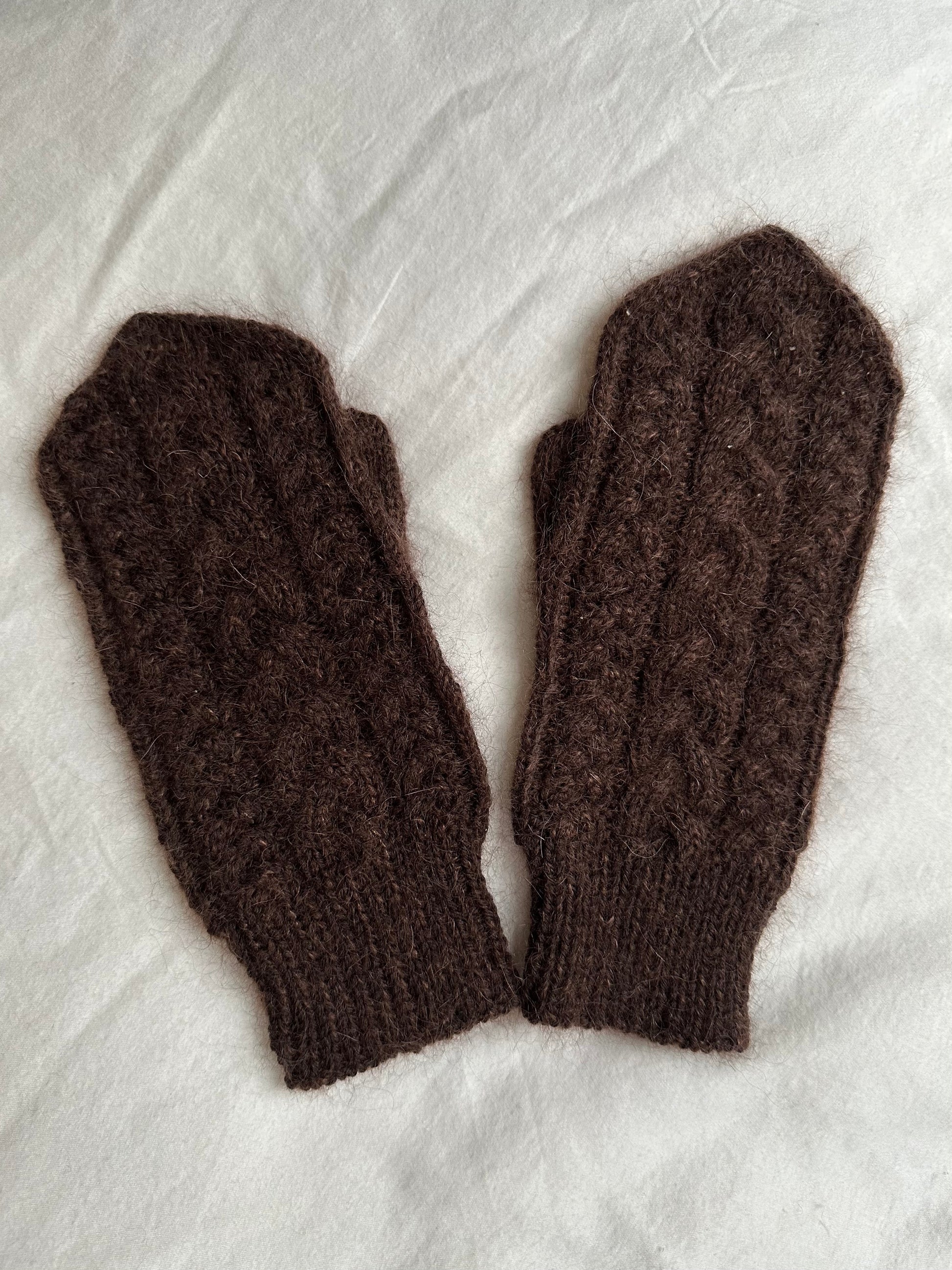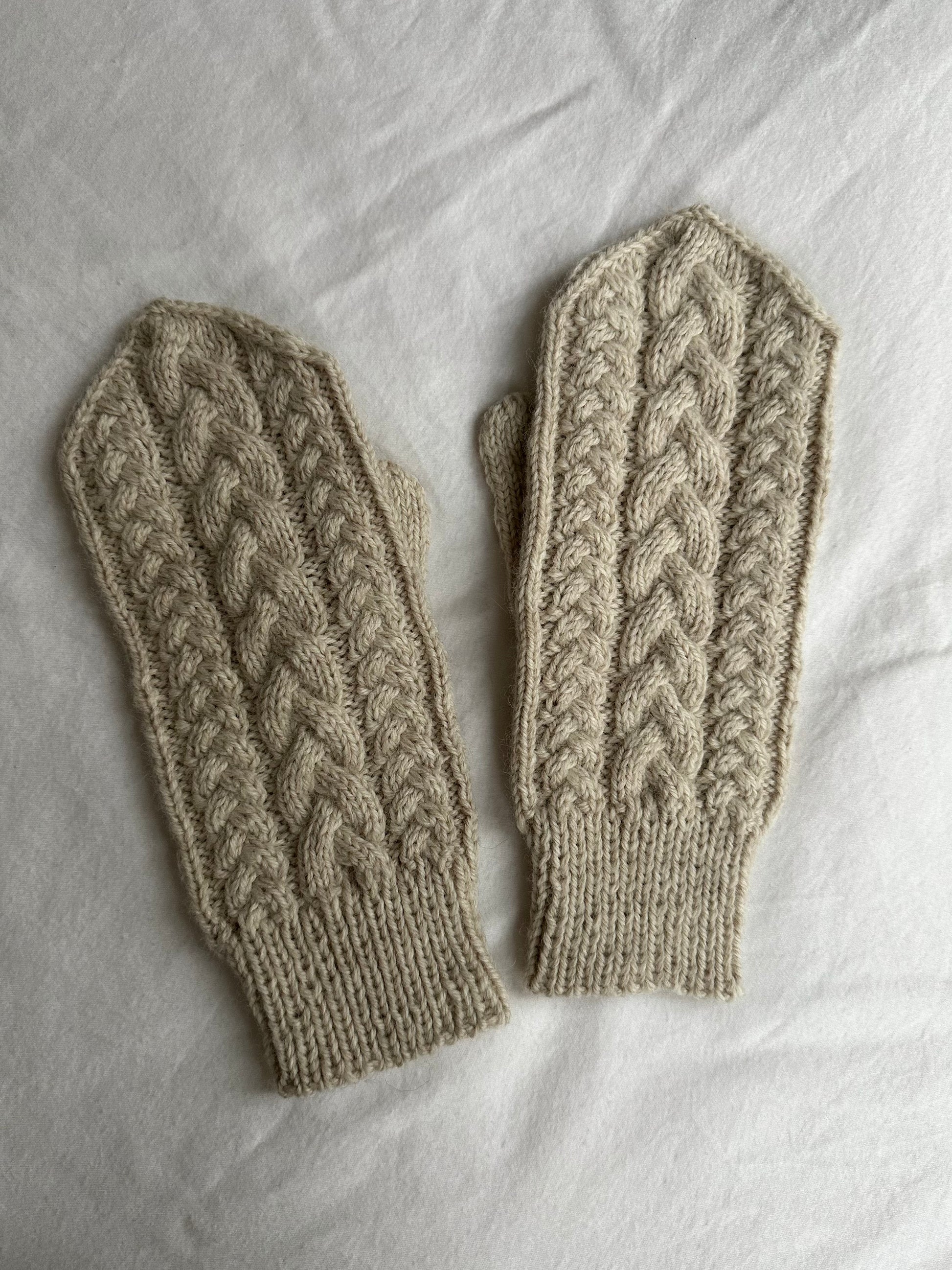 The mittens are knitted from the cuff towards the fingertips. Stitches are cast on with Italian cast-on and worked in the round.The cable-pattern is worked on the front side of the mittens while the backside is worked in stockinette stitch. A hole for the thumb is made along the way. Decreases are made towards the end of the mitten and the last stitches are closed with Garter stitches. Finally, the thumb is worked by picking up stitches, working in stockinette stitch in the round and doing increases at the end.
