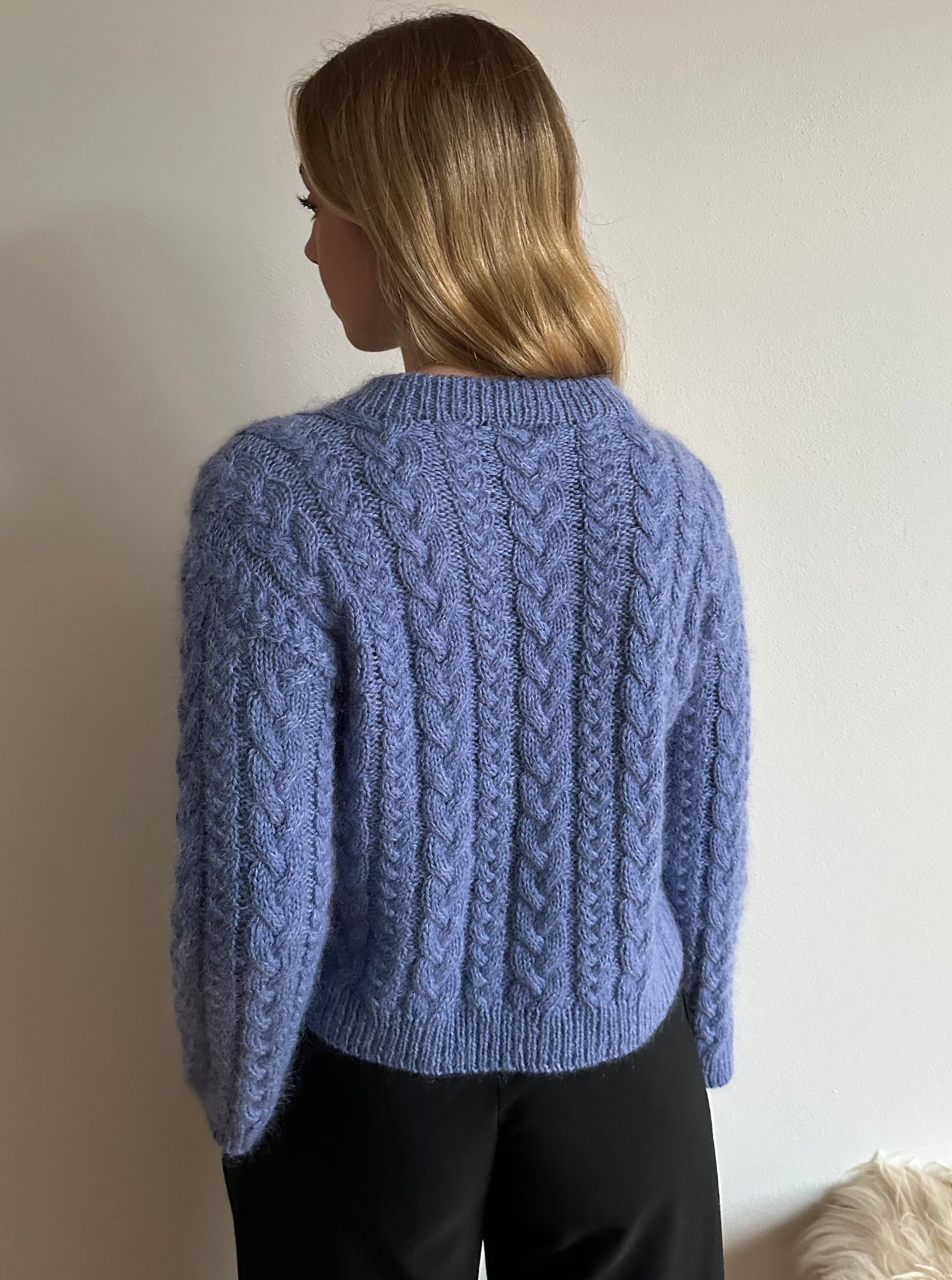 Stitches are picked up along the edge of the neck, worked in rib and knitted down to create a double folded neckline. Finally, the sleeves are worked with short rows and in the round in the braided cable pattern and finished with a rib edge and an Italian cast off.
