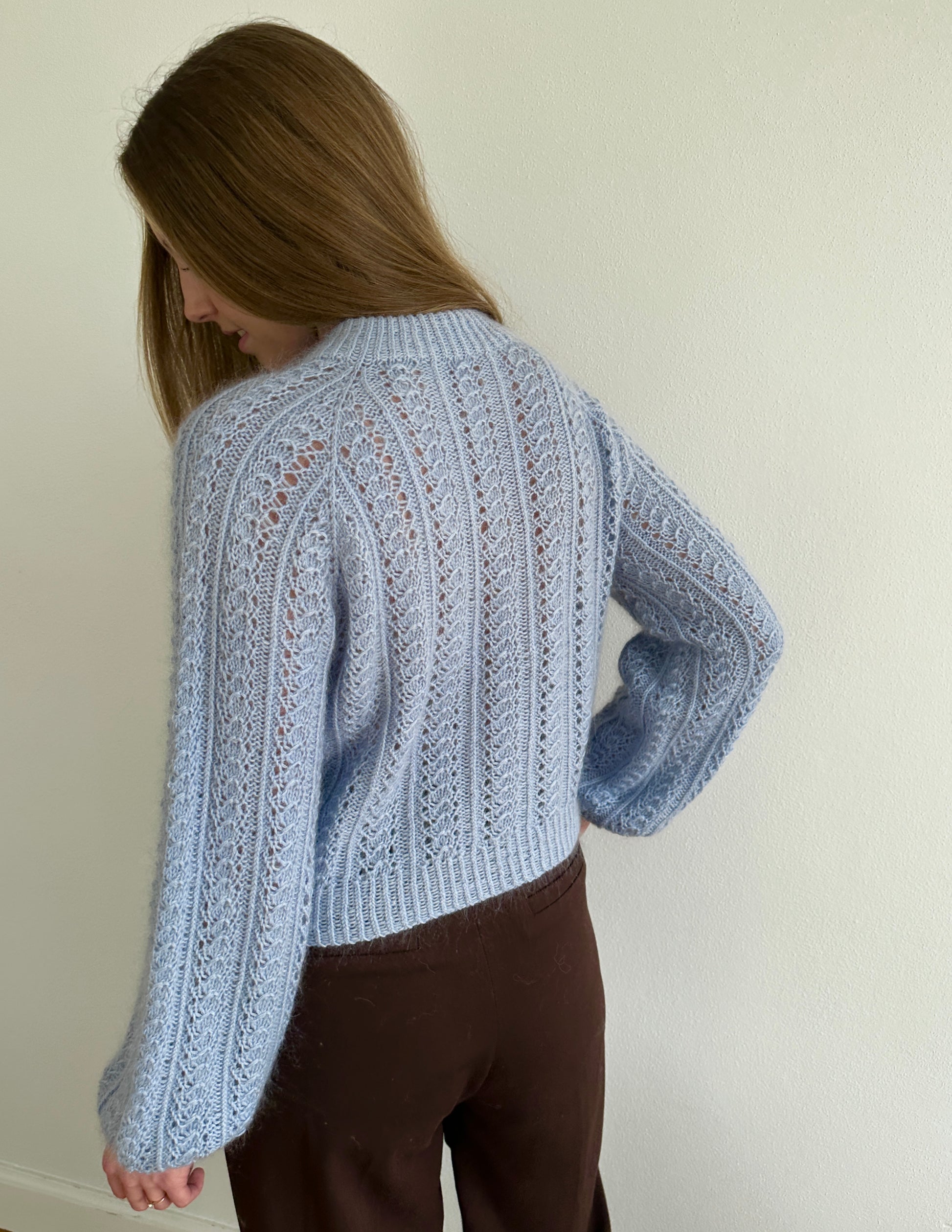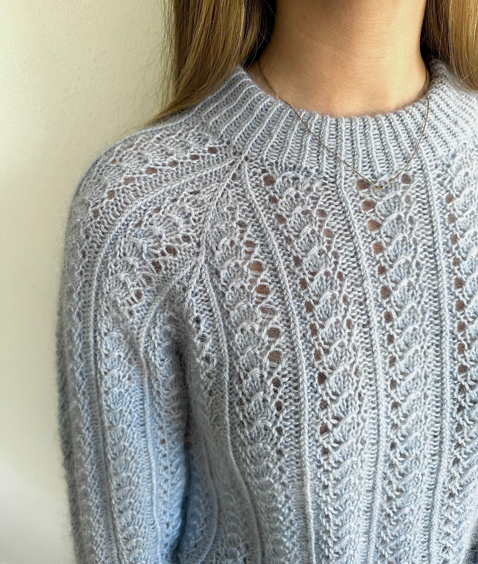 The sweater is knitted from the top down. First, stitches for the neckline are cast on and worked in twisted rib. Stitch-markers are then placed to indicate where raglan-increases are to be made on the yoke. Short rows are worked to shape the yoke, before working in the round. When the yoke is finished, the sleeve-stitches are put to rest, while the body is worked in the round. The body is finished with a twisted rib and Italian cast-off. The sleeves are worked straight down in the shell-lace pattern until a few rounds before the ribbing, where decreases are made to create the balloon-effect. The sleeves are finished with a twisted rib edge and Italian cast-off.