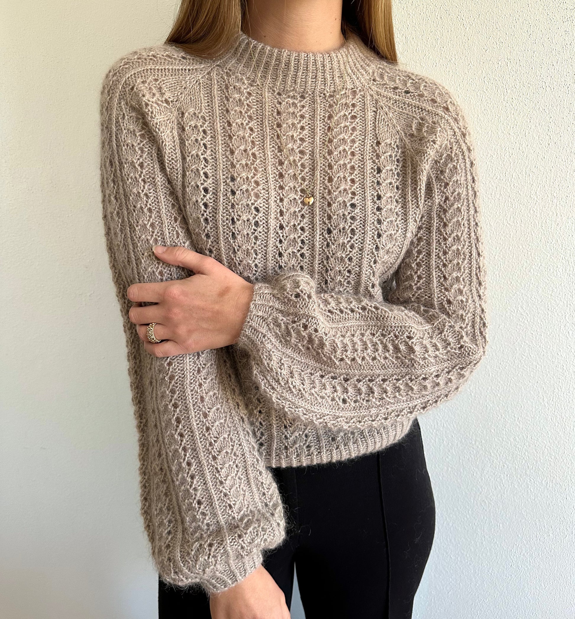 Genseren strikkes ovenfra og ned. Først legges det opp masker til halskanten, som strikkes i vridd ribb og brettes til en dobbelt halskant. Deretter strikkes vendepinner for å skape rett form til bærestykket. Bærestykket strikkes med raglanøkninger rundt 8 maskemarkører. Når bærestykket er ferdigstrikket, settes masker av til ermer. Kroppen strikkes rundt på pinnen og avsluttes med en vridd ribbkant, som felles av med italiensk avfelling. Ermemaskene settes så tilbake på pinnen, og strikkes også i skjellmønsteret. Ved ribbkanten felles det for å skape ballong-effekten. Ermene avsluttes med vridde ribbkanter og italienske avfellinger.
