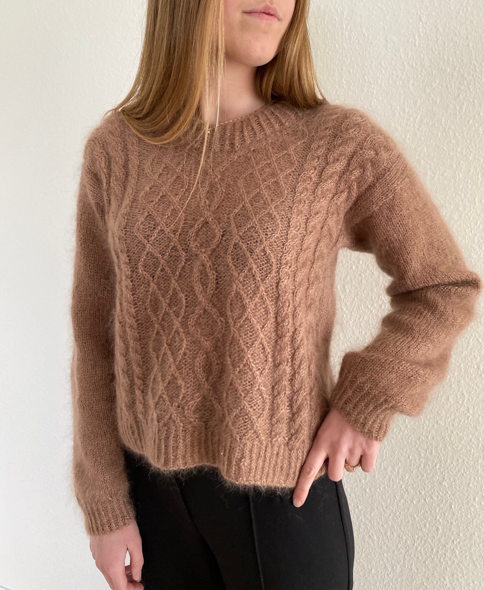 Denne opskrift kombinerer forskellige former for flet, snoninger og strukturstrik til en sweater der strikkes oppefra og ned. Først strikkes rygstykket, hvorefter der samles masker op til skuldre. Forstykket og rygstykket samles og der strikkes på rundpind til sweateren når til fulde længde. Afslutningsvist strikkes den dobbeltfoldede halskant og ærmerne strikkes i glatstrik, med vendepinde for at forme skulderkuplerne.