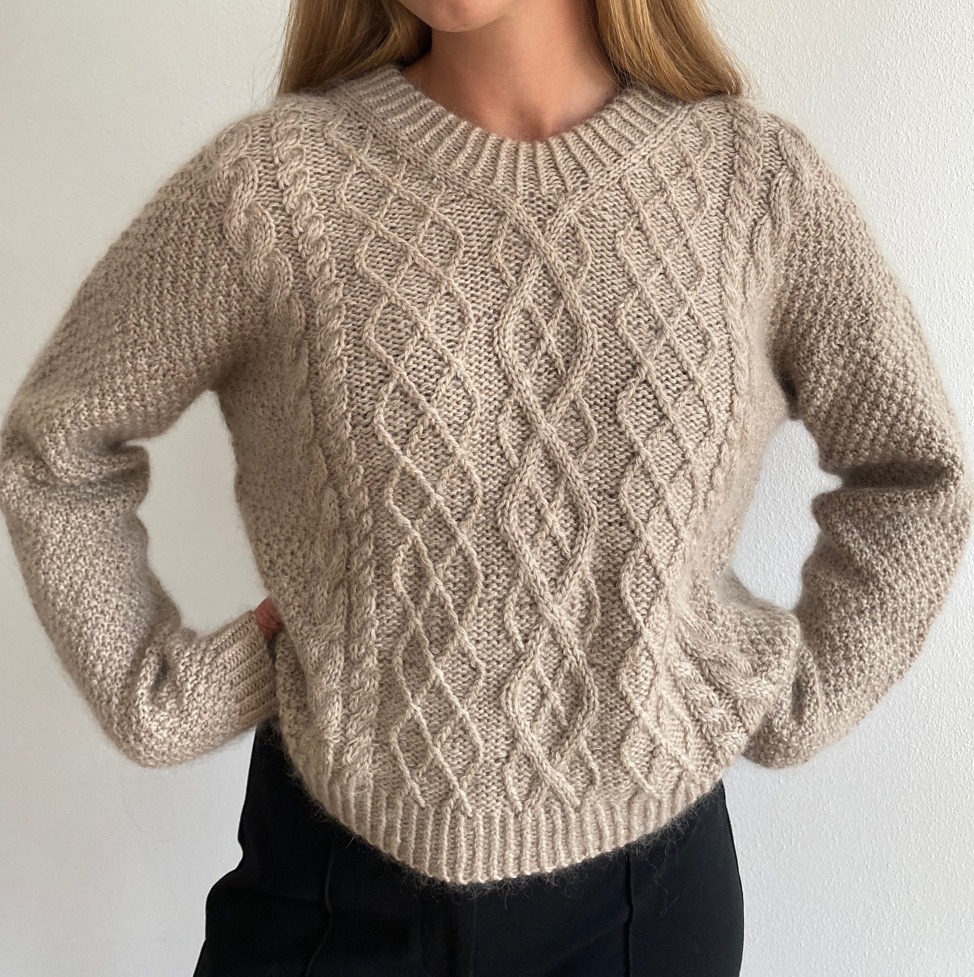 Mayflower Easy Care Classic (50 g = 106 m) sammen med Mayflower Super Kid Silk (25 g = 195 m). Denne genser er Ease Care farve 244 ørkensand + Super Kid Silk farve 98 Nougat.