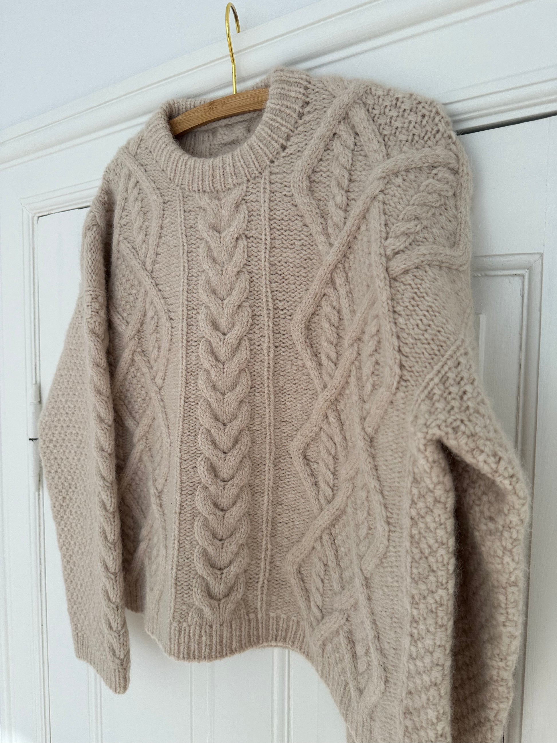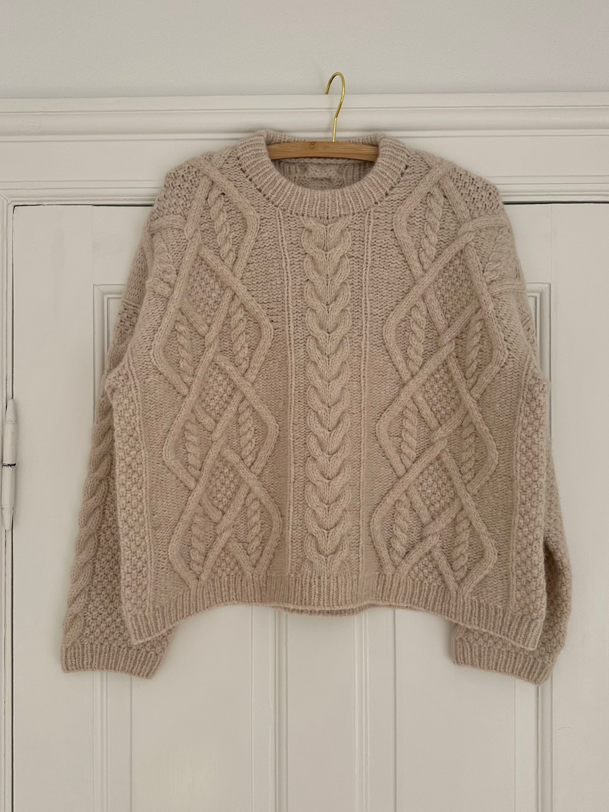 The sweater is knitted from the top down. Stitches are cast on for the back piece, which is worked flat while doing increases. Stitches are then picked up along the upper edge of the back piece, for the left and then right shoulder piece. The two shoulder pieces are worked flat and with increases to create the neckline. The two pieces are joined to create the front piece, which is also worked flat. The front and back pieces are eventually joined, creating the body which is worked in the round and finished with a rib edge and Italian cast-off. Stitches are picked up along the neckline and worked in rib, folded double and knitted into place. Finally, the sleeves are made by picking up stitches along the armholes and working them in the round while doing increases on the underside. They are finished with a rib and Italian cast-off.